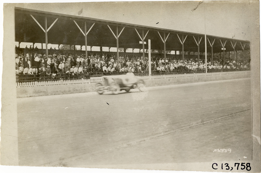 View of driver Bob Burman racing Blitzen Benz car on track during an exhibition at the 1911 Indianapolis 500 races at the Indianapolis Speedway in Indiana. Grandstand in background. Handwritten on back: "Races and racing--Indianapolis 500, 1911."