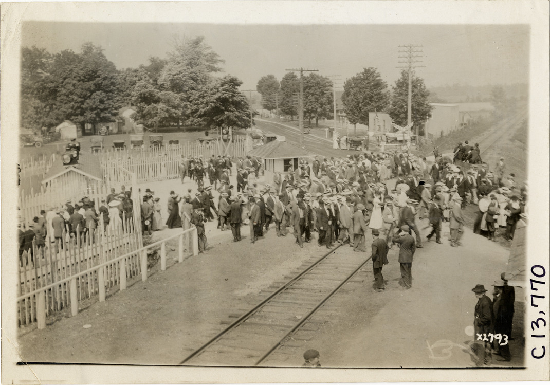 Spectators crossing railroad tracks, 1911 Indianapolis 500 automobile race