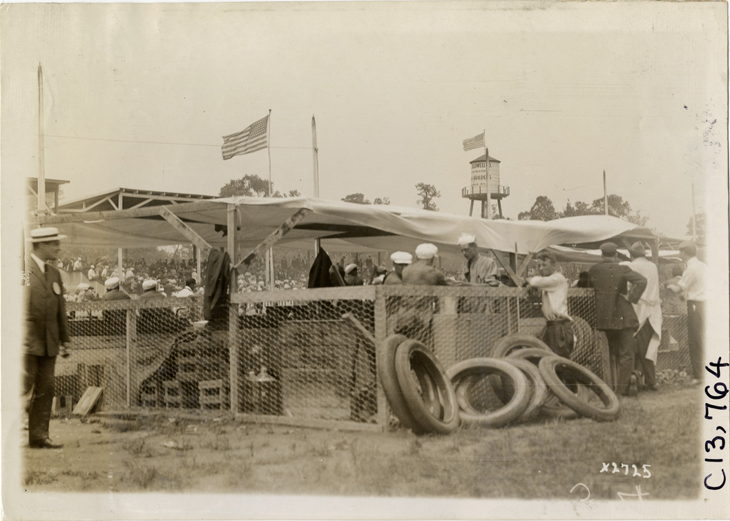 View of men inside covered, fenced enclosure during the 1911 Indianapolis 500 automobile races at the Indianapolis Speedway in Indiana. Several men lean on fence exterior; several tires lean against fence. American flag and water tower in background. Stamped on back: "Spooner & Wells, Inc., photographers, 1231 Woodward Ave., Detroit, Mich., telephone North 1745." Handwritten on back: "Races and racing--Indianapolis 500, 1911."
