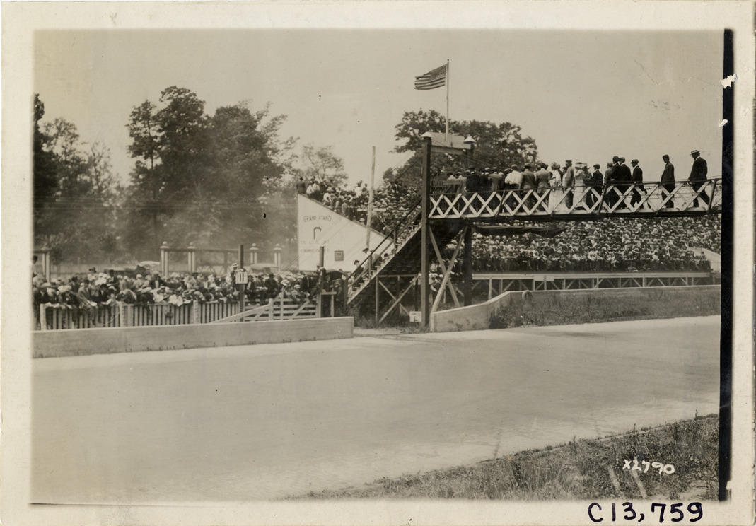 View of spectators walking across pedestrian bridge near grandstand during the 1911 Indianapolis 500 automobile races at the Indianapolis Speedway in Indiana. Stamped on back: "Spooner & Wells, Inc., photographers, 1231 Woodward Ave., Detroit, Mich., telephone North 1745." Handwritten on back: "Races and racing--Indianapolis 500, 1911."