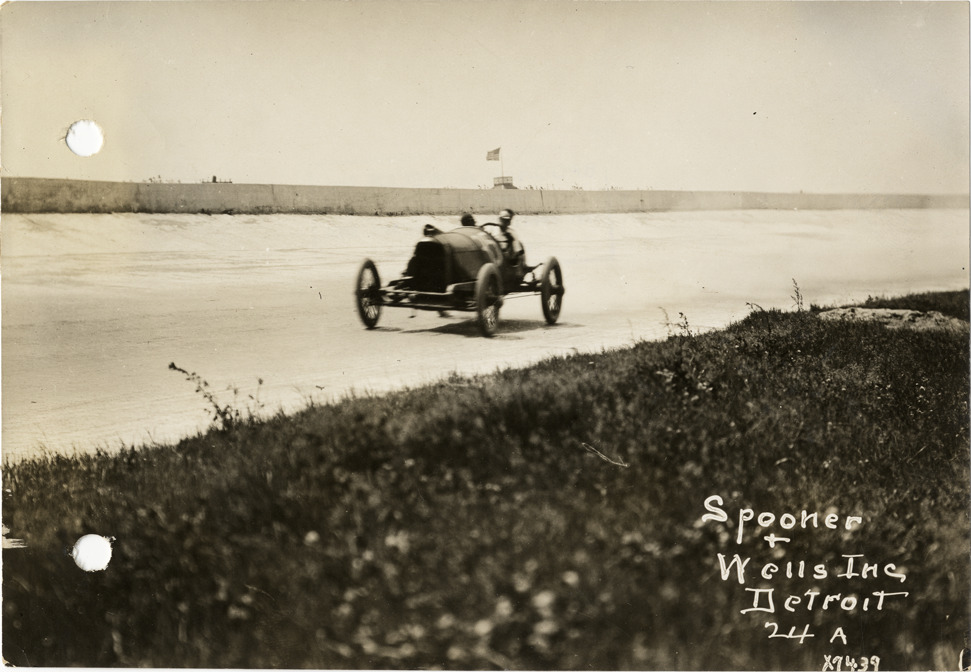 View of Willie Haupt and passenger racing Mason car no. 35 during the 1913 Indianapolis 500 automobile races at the Indianapolis Speedway in Indiana. Printed on front: "Spooner & Wells, Inc., Detroit." Stamped on back: "Spooner & Wells, Inc., photographers, 1231 Woodward Ave., Detroit, Mich., telephone North 1745." Handwritten on back: "Indianapolis Race 1913, Haupt in Mason #35. Races and racing--Indianapolis 500, 1913."