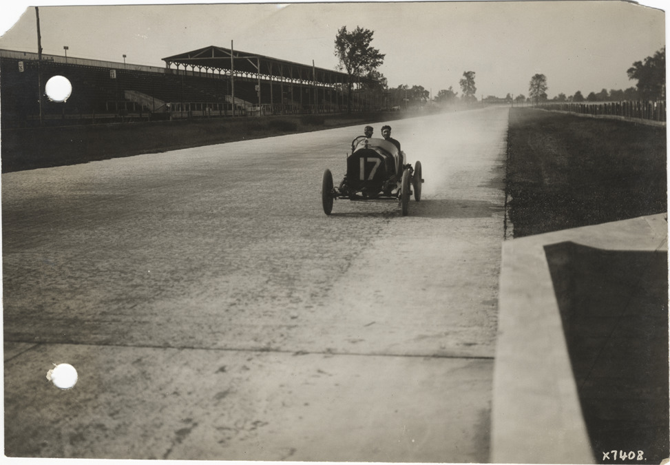 Front view of driver and passenger racing car no. 17 in qualifying race during the 1913 Indianapolis 500 automobile races at the Indianapolis Speedway in Indiana. Grandstand in background. Stamped on back: "Spooner & Wells, Inc., photographers, 1231 Woodward Ave., Detroit, Mich., telephone North 1745." Handwritten on back: "#17 qualifying, Ind. Race, 1913. Races and racing--Indianapolis 500, 1913."