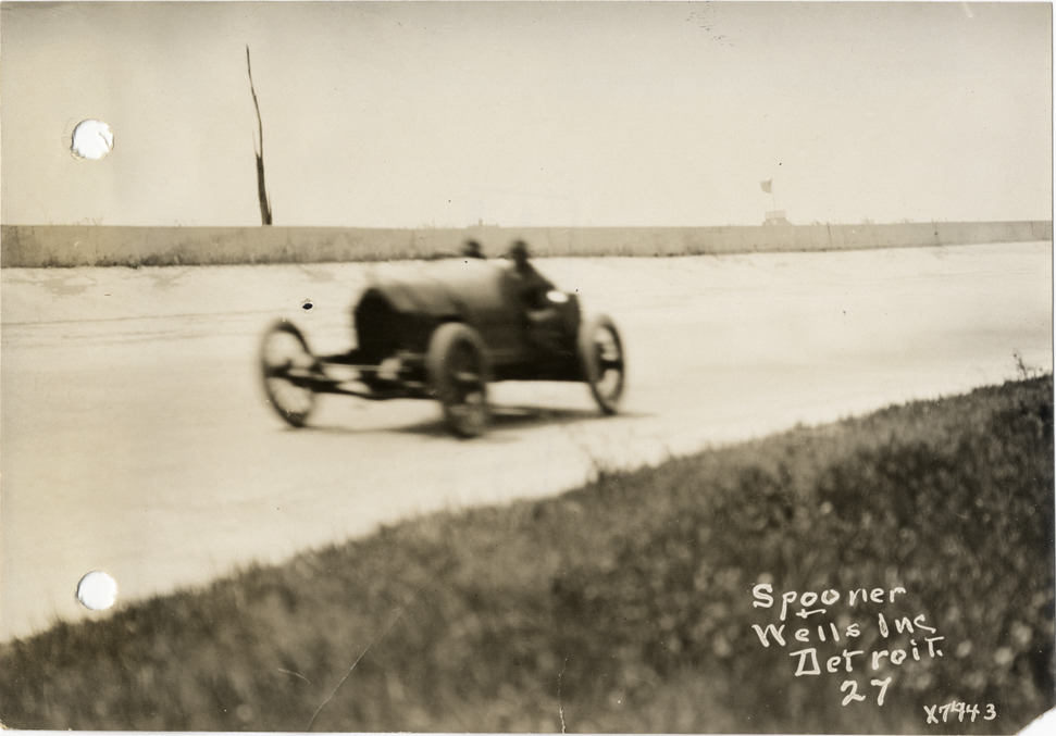 View of Spencer Wishart and passenger racing Mercer car during the 1913 Indianapolis 500 automobile races at the Indianapolis Speedway in Indiana. Printed on front: "Spooner & Wells, Inc., Detroit." Stamped on back: "Spooner & Wells, Inc., photographers, 1231 Woodward Ave., Detroit, Mich., telephone North 1745." Handwritten on back: "Wishart and Mercer down the stretch, Ind. Race, 1913. Races and racing--Indianapolis 500, 1913."