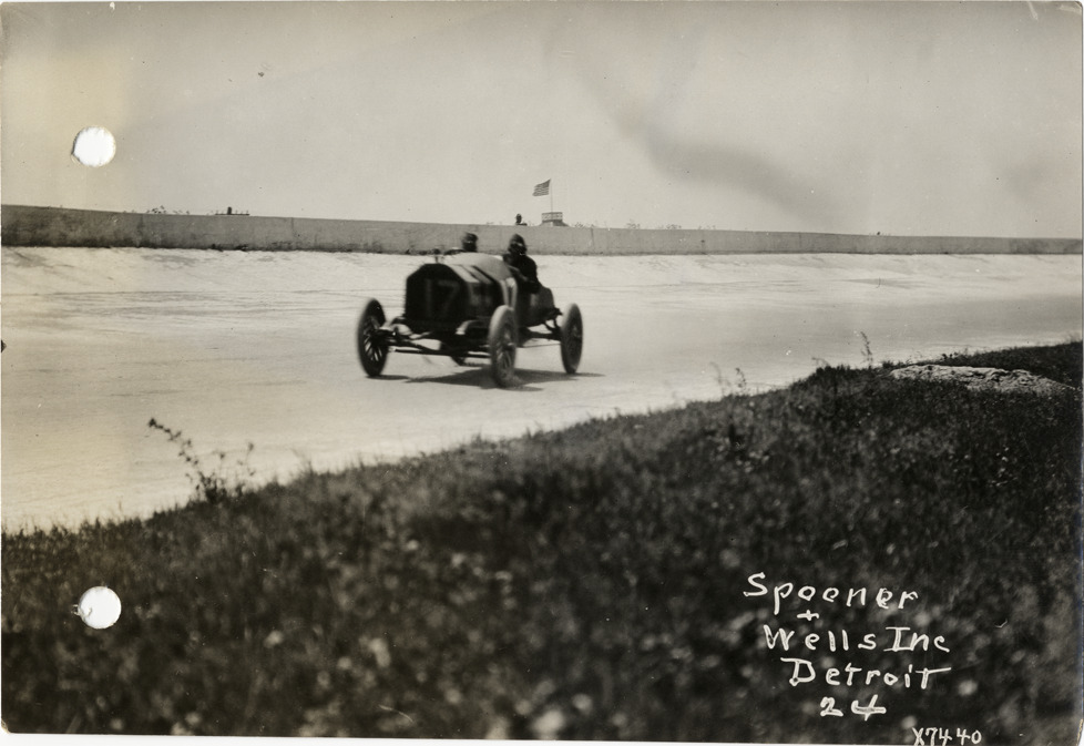 View of driver and passenger racing Anel car no. 17 during the 1913 Indianapolis 500 automobile races at the Indianapolis Speedway in Indiana. Printed on front: "Spooner & Wells, Inc., Detroit." Stamped on back: "Spooner & Wells, Inc., photographers, 1231 Woodward Ave., Detroit, Mich., telephone North 1745." Handwritten on back: "Anel at top speed, Ind. Race, 1913. Races and racing--Indianapolis 500, 1913."