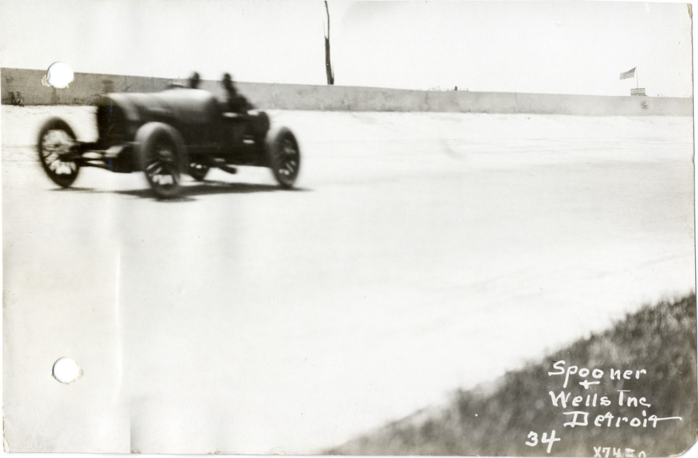 View of driver and passenger racing car on track during the 1913 Indianapolis 500 automobile races at the Indianapolis Speedway in Indiana. Printed on front: "Spooner & Wells, Inc., Detroit." Handwritten on back: "Indianapolis Race, 1913. Races and racing--Indianapolis 500, 1913."
