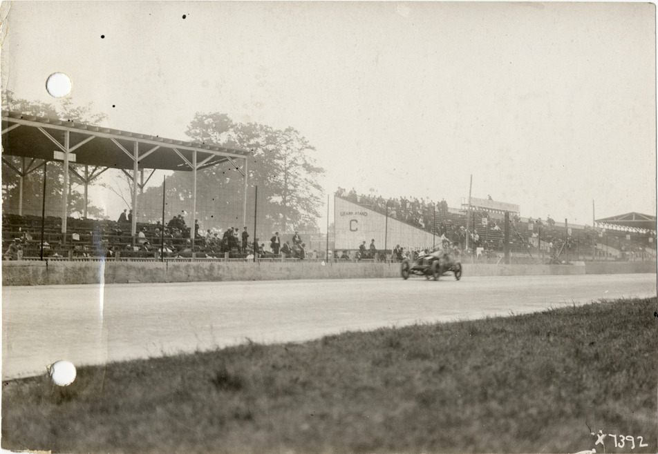 View of Bob Burman racing Keeton car past grandstand during the 1913 Indianapolis 500 automobile races at the Indianapolis Speedway in Indiana. Handwritten on back: "Indianapolis Race 1913, Burman making record lap, end of 100 miles. Races and racing--Indianapolis 500, 1913."