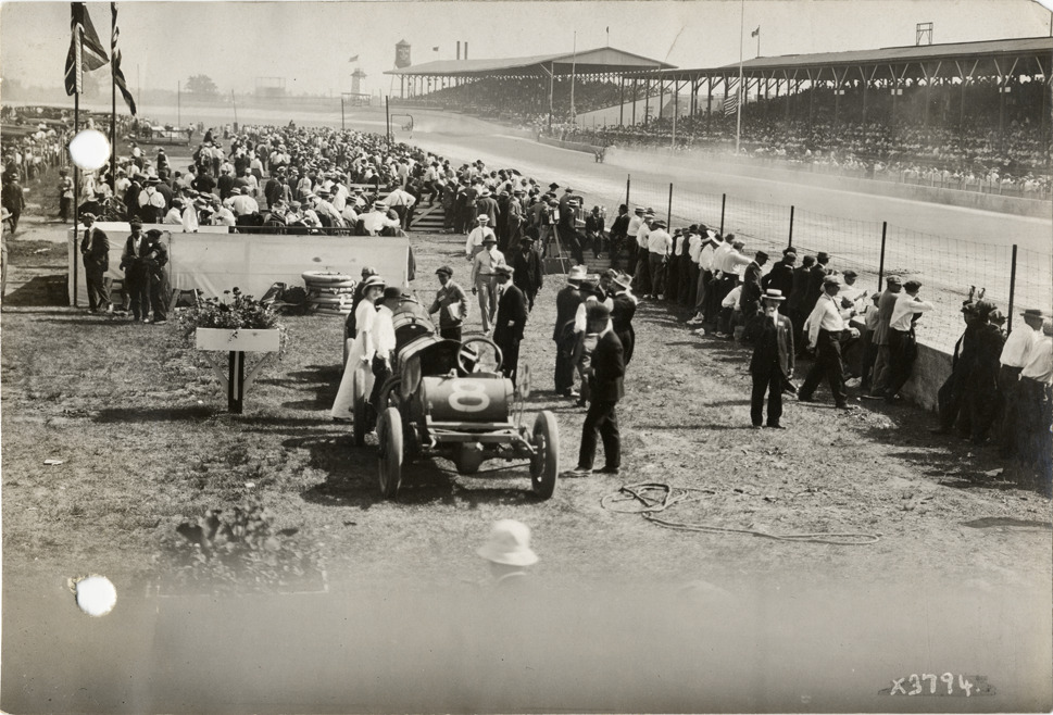 View of racetrack, 1913 Indianapolis 500 automobile race