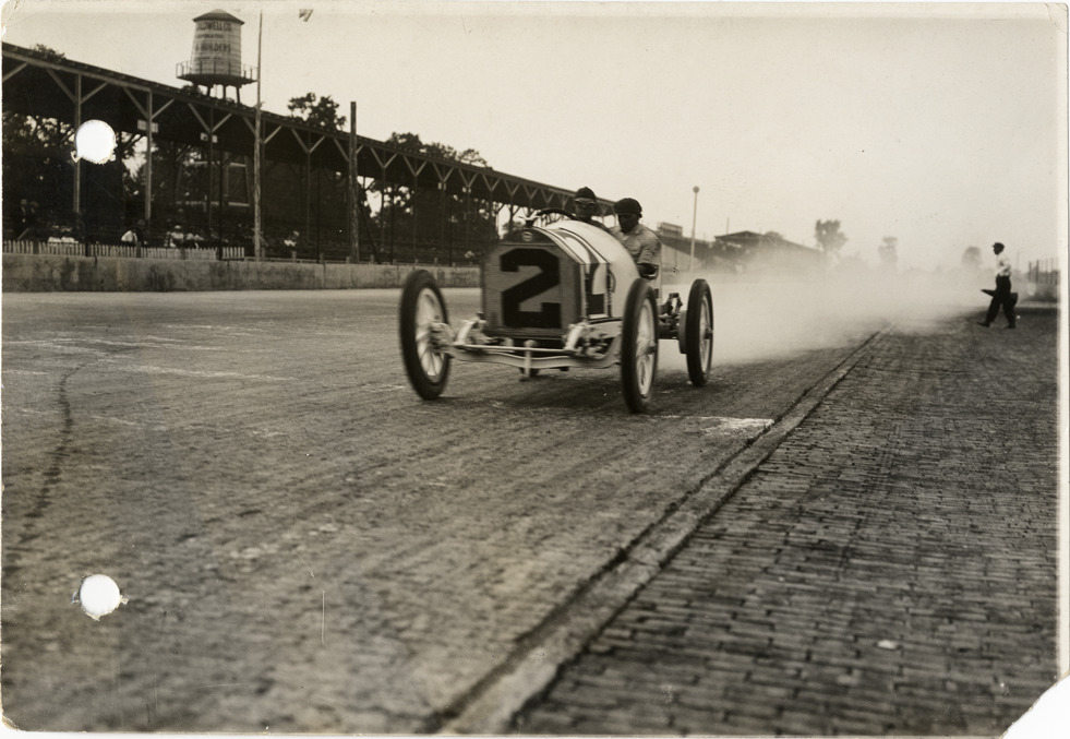 View of driver and passenger racing Stutz car no. 2 in trial race during the 1913 Indianapolis 500 automobile races at the Indianapolis Speedway in Indiana. Stamped on back: "Spooner & Wells, Inc., photographers, 1231 Woodward Ave., Detroit, Mich., telephone North 1745." Handwritten on back: "Stutz #2 in trial race, Ind. Race, 1913. Races and racing--Indianapolis 500, 1913."