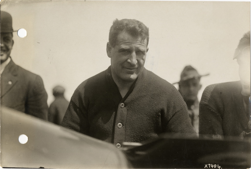 Close-up view of driver Johnny Jenkins during the 1913 Indianapolis 500 automobile races at the Indianapolis Speedway in Indiana. Stamped on back: "Spooner & Wells, Inc., photographers, 1231 Woodward Ave., Detroit, Mich., telephone North 1745." Handwritten on back: "Head view Jenkins, Schacht #18, Ind. Race, 1913. Races and racing--Indianapolis 500, 1913."