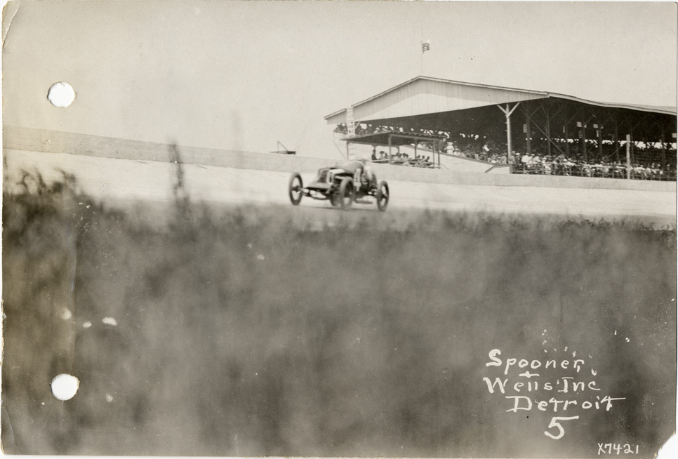 View of driver and passenger racing Keeton car no. 4 during the 1913 Indianapolis 500 automobile races at the Indianapolis Speedway in Indiana. Grandstand in background. Printed on front: "Spooner & Wells, Inc., Detroit." Handwritten on back: "Keeton on the track, Ind. Race, 1913. Races and racing--Indianapolis 500, 1913."