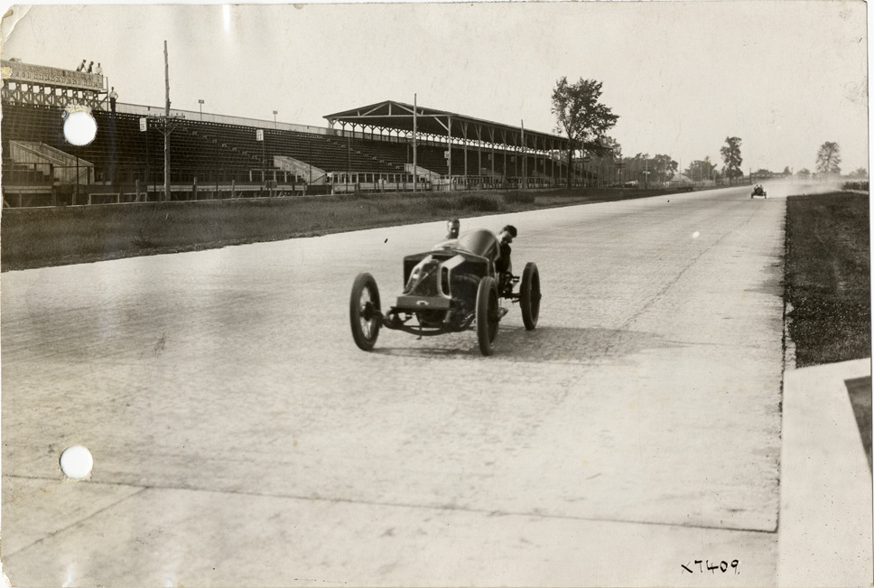 View of Bob Burman and passenger in Keeton car on track during the 1913 Indianapolis 500 automobile races at the Indianapolis Speedway in Indiana. Grandstand in background. Handwritten on back: "Indianapolis Race 1913. Burman qualifying. Races and racing--Indianapolis 500, 1913."
