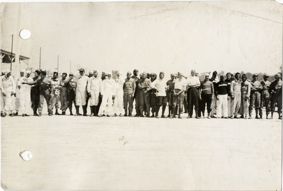 Racecar drivers posing in row, 1913 Indianapolis 500 automobile race