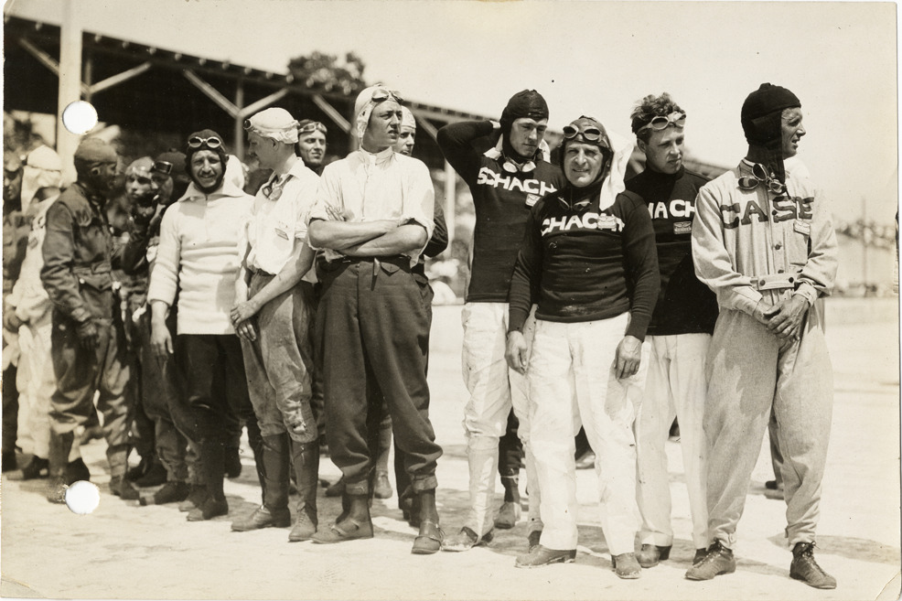 View of Case, Schacht and Fox racecar drivers during the 1913 Indianapolis 500 automobile races at the Indianapolis Speedway in Indiana. Stamped on back: "Spooner & Wells, Inc., photographers, 1231 Woodward Ave., Detroit, Mich., telephone North 1745." Handwritten on back: "Case, Schacht and Fox drivers (group), Ind. Race, 5/30/13. Races and racing--Indianapolis 500, 1913."
