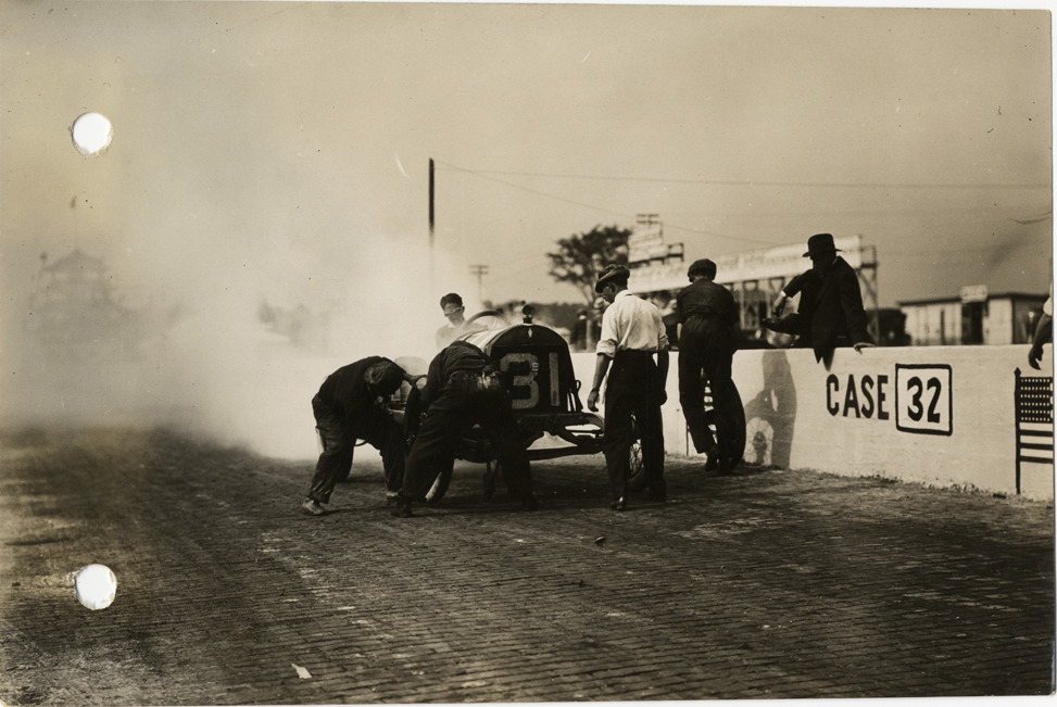 View of Louis Disbrow and crew changing tires on Case car no. 31 adjacent to pits during the 1913 Indianapolis 500 automobile races at the Indianapolis Speedway in Indiana. Stamped on back: "Spooner & Wells, Inc., photographers, 1231 Woodward Ave., Detroit, Mich., telephone North 1745." Handwritten on back: "Disbrow changing tires at pit, time 31 seconds, Ind. Race, 1913. Races and racing--Indianapolis 500, 1913."