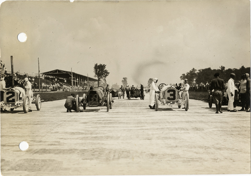 Racecars at starting line, 1913 Indianapolis 500 automobile race