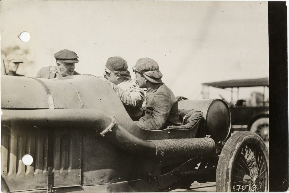 View of Paul Zuccarelli and passenger in Peugeot car, speaking to another man, during the 1913 Indianapolis 500 automobile races at the Indianapolis Speedway in Indiana. Handwritten on back: "Indianapolis Race 1913, Zucarelli in Peugeot #45. Races and racing--Indianapolis 500, 1913."