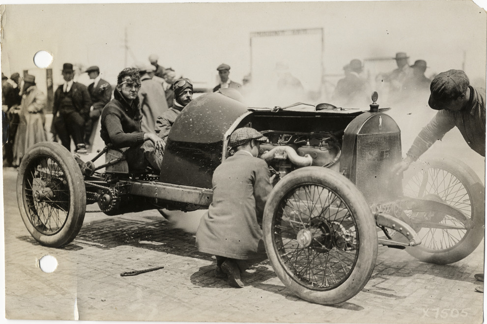 View of H.J. Kilpatrick and passenger in Case car no. 31 during the 1913 Indianapolis 500 automobile races at the Indianapolis Speedway in Indiana. Two men work on car; spectators in background. Handwritten on back: "Indianapolis Race 1913, Kilpatrick in Case. Races and racing--Indianapolis 500, 1913."