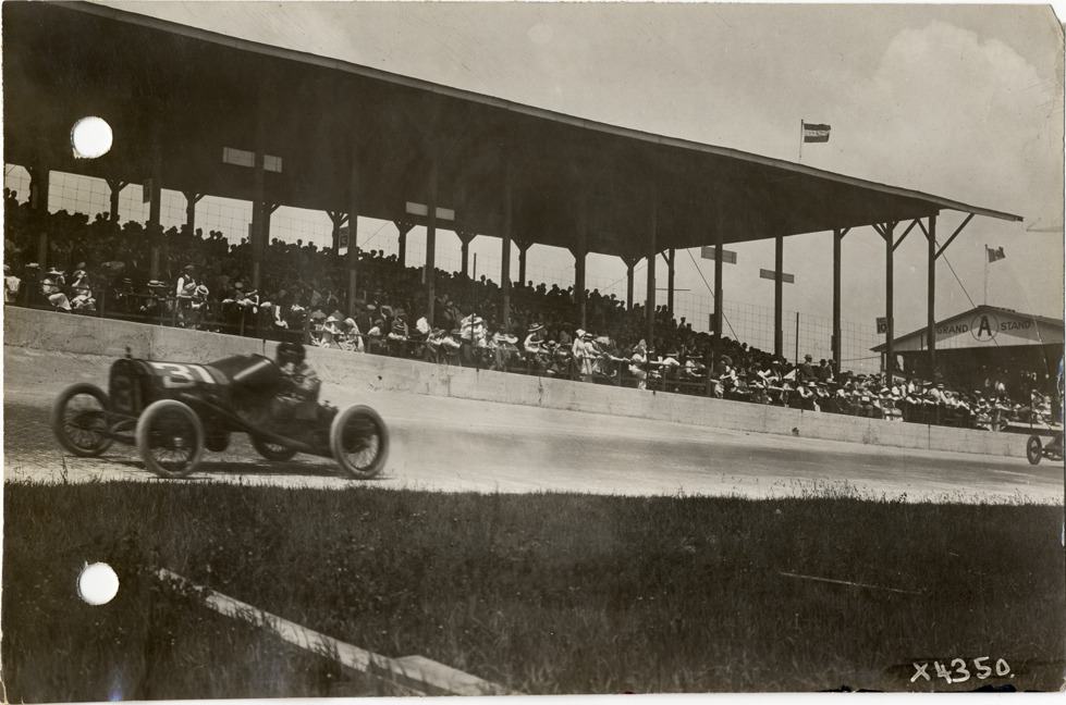 Case racecar passing grandstand, 1913 Indianapolis 500 automobile race