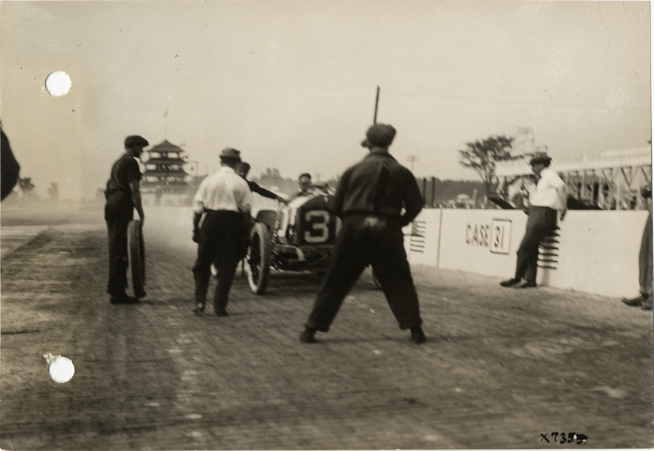 View of pit crew waiting to change tires on Case car no. 31 during the 1913 Indianapolis 500 automobile races at the Indianapolis Speedway in Indiana. Stamped on back: "Spooner & Wells, Inc., photographers, 1231 Woodward Ave., Detroit, Mich., telephone North 1745." Handwritten on back: "Indianapolis Race 1913, pit operators ready to make change of tires. Races and racing--Indianapolis 500, 1913."