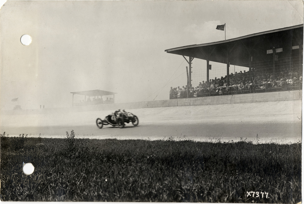View of Bob Burman and passenger racing Keeton car no. 4 past grandstand during the 1913 Indianapolis 500 automobile races at the Indianapolis Speedway in Indiana. Handwritten on back: "Indianapolis Race 1913, Burman rounding curve. Races and racing--Indianapolis 500, 1913."