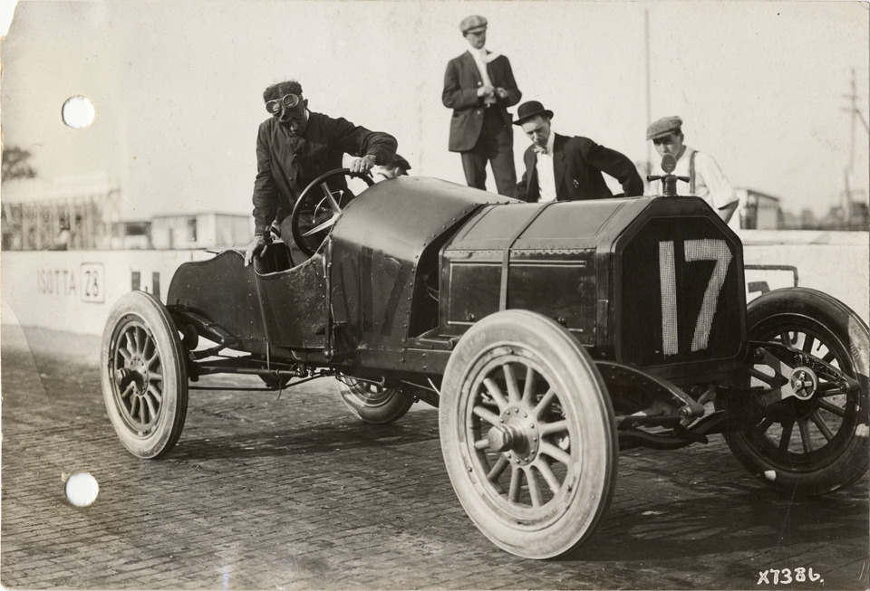 View of Billy Liesaw in Anel car no. 17 during the 1913 Indianapolis 500 automobile races at the Indianapolis Speedway in Indiana. Three men stand in background. Handwritten on back: "Indianapolis Race 1913, Liesaw in Anel #17, side view. Races and racing--Indianapolis 500, 1913."