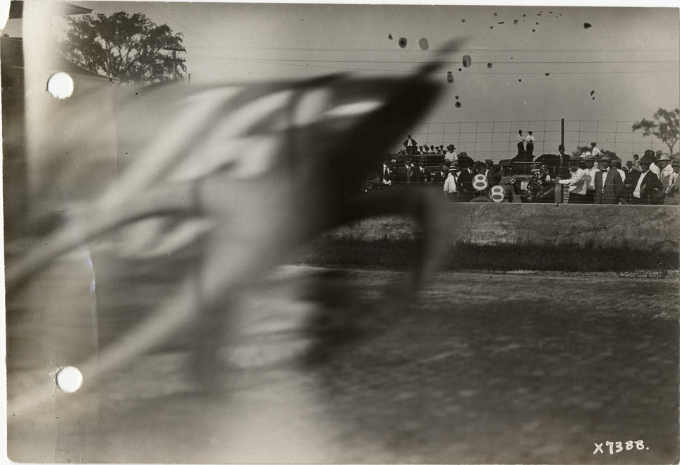 View of spectators standing behind fence during the 1913 Indianapolis 500 automobile races at the Indianapolis Speedway in Indiana. Handwritten on back: "Indianapolis Race 1913. Races and racing--Indianapolis 500, 1913."