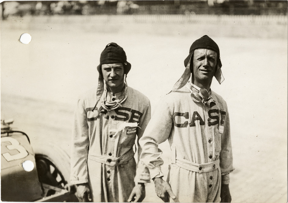 View of driver Bill Endicott and mechanic during the 1913 Indianapolis 500 automobile races at the Indianapolis Speedway in Indiana. Both men wear "Case" coveralls. Stamped on back: "Spooner & Wells, Inc., photographers, 1231 Woodward Ave., Detroit, Mich., telephone North 1745." Handwritten on back: "Case team, Endicott & mechanic, Ind. Race 1913. Races and racing--Indianapolis 500, 1913."