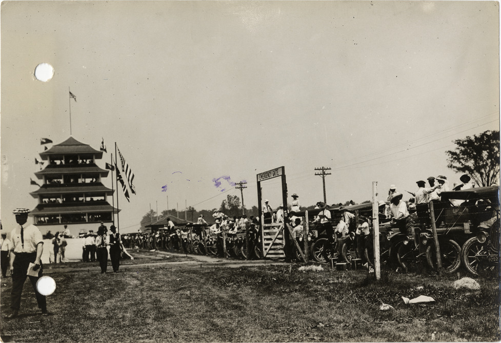View of spectators with their cars on trackside during the 1913 Indianapolis 500 automobile races at the Indianapolis Speedway in Indiana. Pagoda in background. Stamped on back: "Spooner & Wells, Inc., photographers, 1231 Woodward Ave., Detroit, Mich., telephone North 1745." Handwritten on back: "General view parking space, Ind. Race 1913. Races and racing--Indianapolis 500, 1913."
