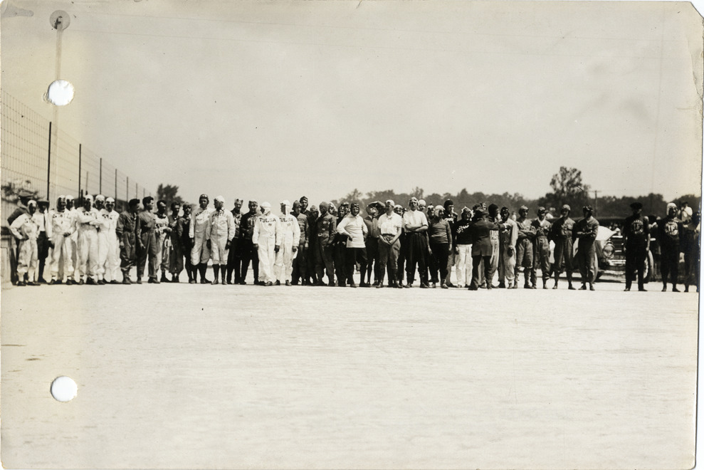 View of racecar drivers posing in row during the 1913 Indianapolis 500 automobile races at the Indianapolis Speedway in Indiana. Stamped on back: "Spooner & Wells, Inc., photographers, 1231 Woodward Ave., Detroit, Mich., telephone North 1745." Handwritten on back: "Full lineup of drivers, Ind. Race 1913. Races and racing--Indianapolis 500, 1913."