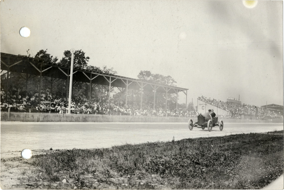 View of Harry Endicott and passenger racing car past grandstand during the 1913 Indianapolis 500 automobile races at the Indianapolis Speedway in Indiana. Handwritten on back: "Indianapolis Race 1913, Endicott passing grandstand. Races and racing--Indianapolis 500, 1913."