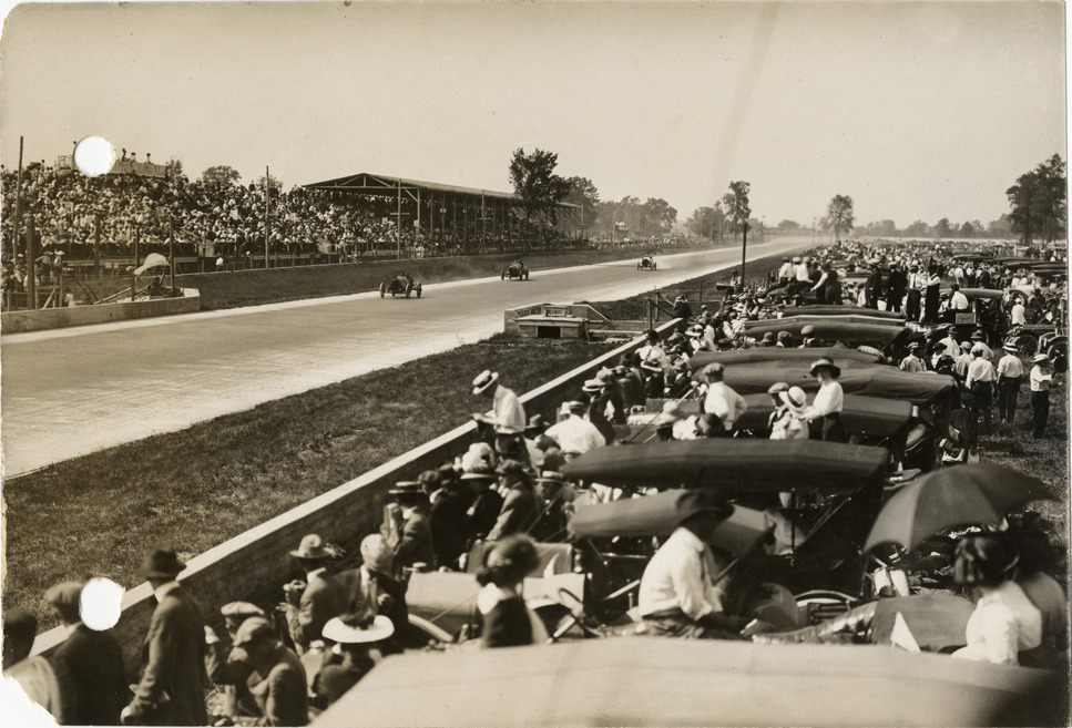 View of racetrack showing grandstand, racecars and spectators during the 1913 Indianapolis 500 automobile races at the Indianapolis Speedway in Indiana. Stamped on back: "Spooner & Wells, Inc., photographers, 1231 Woodward Ave., Detroit, Mich., telephone North 1745." Handwritten on back: "Indianapolis Race 1913, general view showing parking space, track & grandstand. Races and racing--Indianapolis 500, 1913."