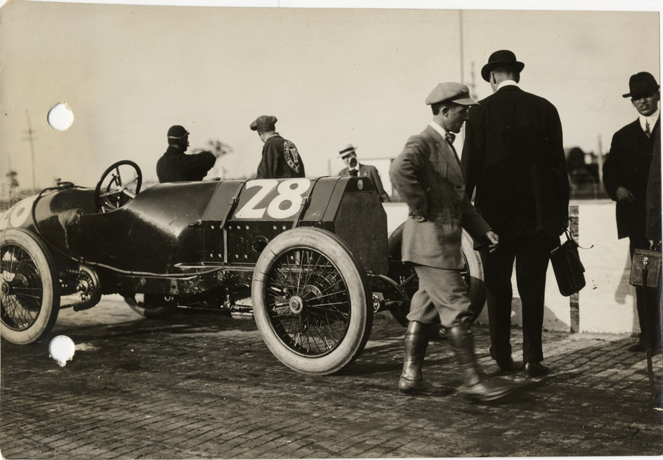 View of men standing near Isotta-Fraschini car no. 28 in pits during the 1913 Indianapolis 500 automobile races at the Indianapolis Speedway in Indiana. Stamped on back: "Spooner & Wells, Inc., photographers, 1231 Woodward Ave., Detroit, Mich., telephone North 1745." Handwritten on back: "Indianapolis Race 1913, Trucco at pit (Isotta). Races and racing--Indianapolis 500, 1913."
