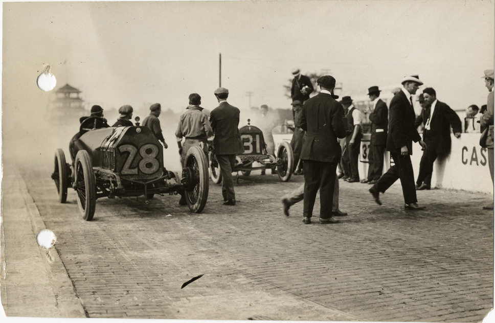 View of men standing near cars no. 28 and no. 31 in pits during the 1913 Indianapolis 500 automobile races at the Indianapolis Speedway in Indiana. Stamped on back: "Spooner & Wells, Inc., photographers, 1231 Woodward Ave., Detroit, Mich., telephone North 1745." Handwritten on back: "Indianapolis Race 1913, Cars #28 & #31 at pit changing tires. Races and racing--Indianapolis 500, 1913."