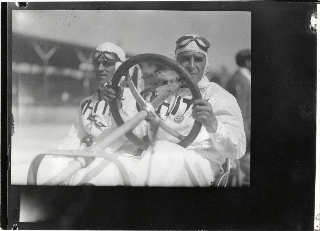Close-up view of Johnny Jenkins and passenger in White racecar during the 1912 Indianapolis 500 automobile races at the Indianapolis Speedway in Indiana. Stamped on back: "Photographic illustration by Nick Lazarnick, 230 Park Ave., N.Y." Typed on back: "Johnny Jenkins at the wheel of a White at Indianapolis in 1912. Handwritten on back: "Races and racing--Indianapolis 500, 1912."