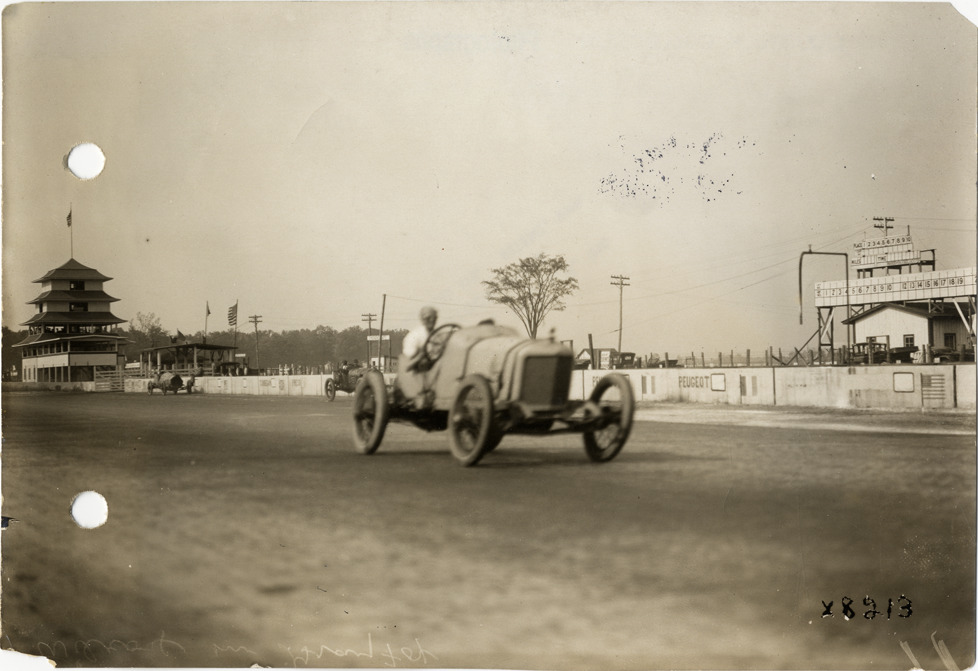 View of Howdy Wilcox racing Gray Fox car during the 1914 Indianapolis 500 automobile races at the Indianapolis Speedway in Indiana. Pagoda in background. Stamped on back: "Spooner & Wells, Inc., photographers, 1231 Woodward Ave., Detroit, Mich., telephone North 1745." Handwritten on back: "Wilcox in Gray Fox, Ind. Race, May 1914. Races and racing--Indianapolis 500, 1914."