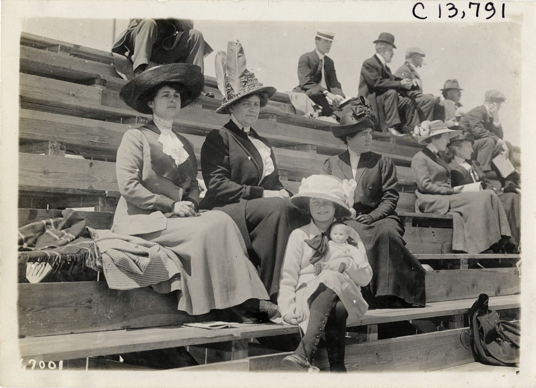 View of three women and a girl sitting in bleachers during the 1911 automobile races at Atlantic-Pablo Beach in Jacksonville, Florida. Girl holds doll. Stamped on back: "Spooner & Wells, Inc., photographers, telephones 3472-3473 Columbus, 1931 Broadway, New York." Handwritten on back: "Races and racing--Jacksonville races, 1911."