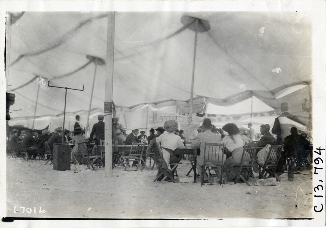 View of men and women sitting at tables under tent during the 1911 automobile races at Atlantic-Pablo Beach in Jacksonville, Florida. Stamped on back: "Spooner & Wells, Inc., photographers, telephones 3472-3473 Columbus, 1931 Broadway, New York." Handwritten on back: "Races and racing--Jacksonville races, 1911."