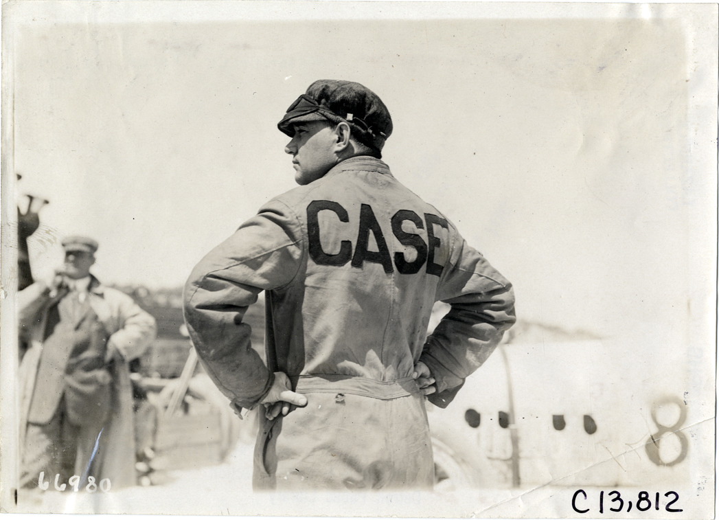 Close-up view of Case driver during the 1911 automobile races at Atlantic-Pablo Beach in Jacksonville, Florida. Stamped on back: "Spooner & Wells, Inc., photographers, telephones 3472-3473 Columbus, 1931 Broadway, New York." Handwritten on back: "Races and racing--Jacksonville races, 1911."