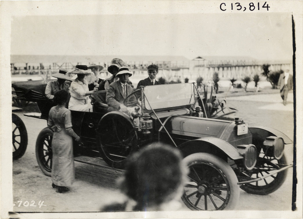 View of spectators in car during the 1911 automobile races at Atlantic-Pablo Beach in Jacksonville, Florida. Stamped on back: "Spooner & Wells, Inc., photographers, telephones 3472-3473 Columbus, 1931 Broadway, New York." Handwritten on back: "Races and racing--Jacksonville races, 1911."