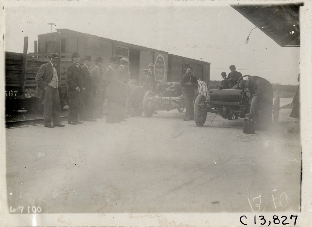 Men with racecars at railroad station, 1911 Jacksonville automobile races