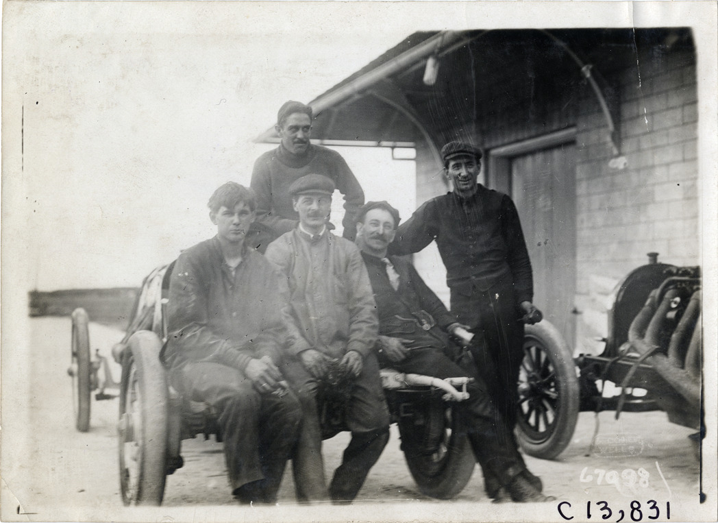 View of five men posing with racecar at train station during the 1911 automobile races at Atlantic-Pablo Beach in Jacksonville, Florida. Stamped on back: "Spooner & Wells, Inc., photographers, telephones 3472-3473 Columbus, 1931 Broadway, New York." Handwritten on back: "Races and racing--Jacksonville races, 1911."