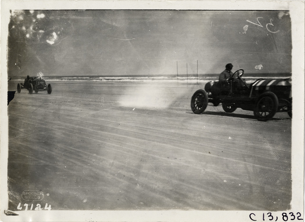 View of two cars racing on beach during the 1911 automobile races at Atlantic-Pablo Beach in Jacksonville, Florida. Stamped on back: "Spooner & Wells, Inc., photographers, telephones 3472-3473 Columbus, 1931 Broadway, New York." Handwritten on back: "Races and racing--Jacksonville races, 1911."