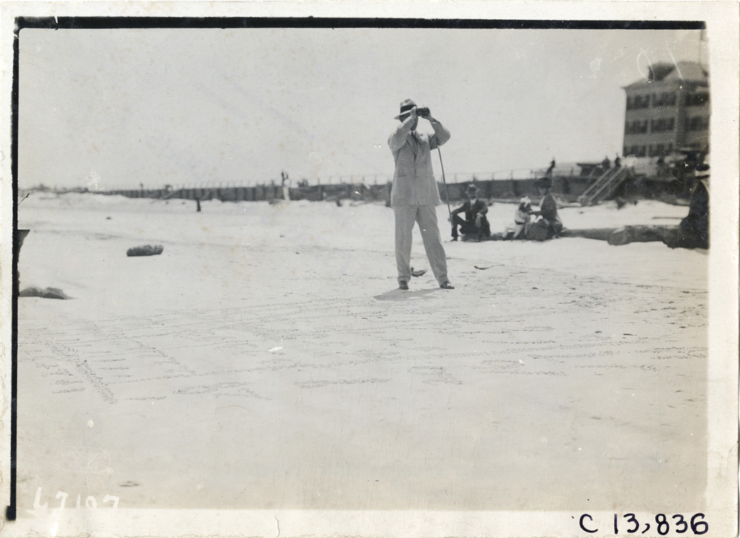 View of man looking through binoculars during the 1911 automobile races at Atlantic-Pablo Beach in Jacksonville, Florida. Stamped on back: "Spooner & Wells, Inc., photographers, telephones 3472-3473 Columbus, 1931 Broadway, New York." Handwritten on back: "Races and racing--Jacksonville races, 1911."