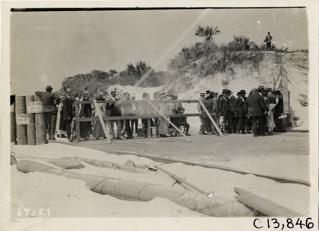 View of spectators on boardwalk behind wooden fence or barrier during the 1911 automobile races at Atlantic-Pablo Beach in Jacksonville, Florida. Stamped on back: "Spooner & Wells, Inc., photographers, telephones 3472-3473 Columbus, 1931 Broadway, New York." Handwritten on back: "Races and racing--Jacksonville races, 1911."