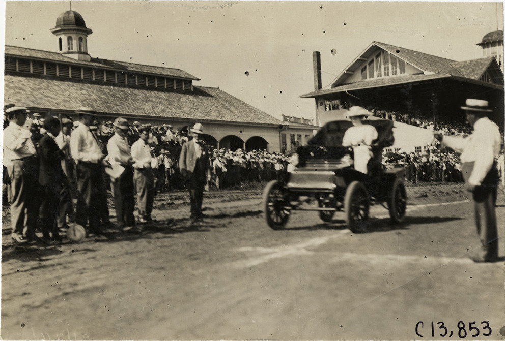 View of woman driving electric car in obstacle race during the 1909 automobile races at the Elm Ridge racetrack in Kansas City, Missouri. Spectators in background. Handwritten on back: "Obstacle race, 7/31/09. Races and racing--Kansas City auto races, 1909."