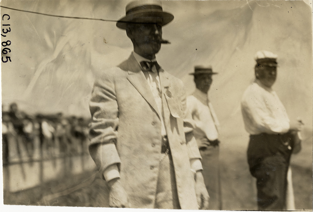 View of W.W. Cowan, president of the Kansas City Automobile Club during the 1909 automobile races at the Elm Ridge racetrack in Kansas City, Missouri. Handwritten on back: "President Cowan of the Kansas City Automobile Club, 7/31/09. Races and racing--Kansas City auto races, 1909."