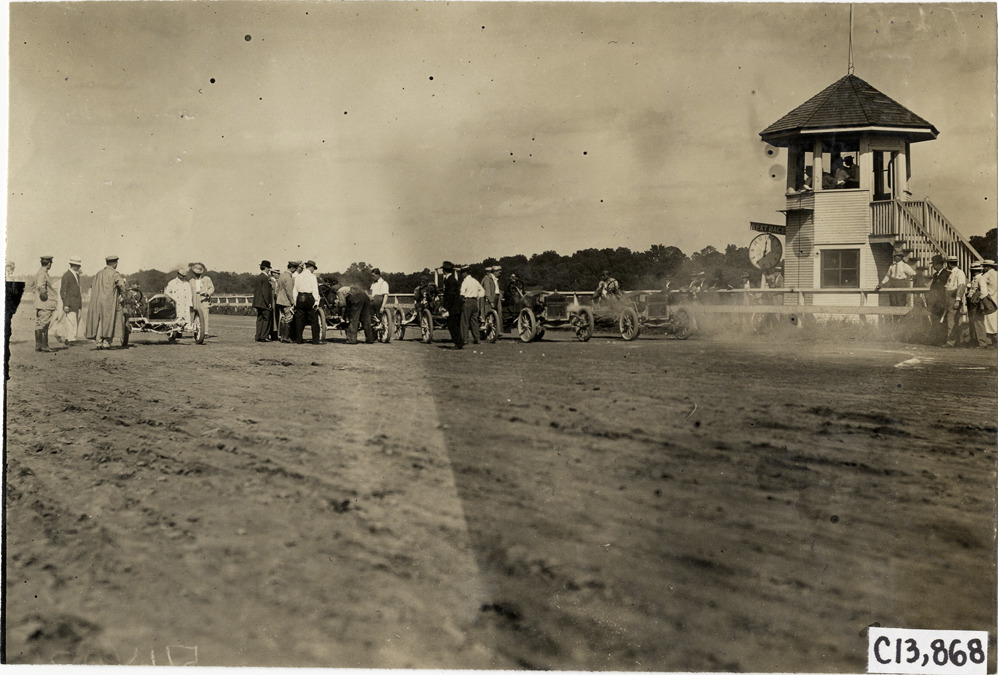 View of men standing near row of cars at starting line during the 1909 automobile races at the Elm Ridge racetrack in Kansas City, Missouri. Timers' stand in background. Handwritten on back: "Line up for start of the 3rd event, 7/31/09. Races and racing--Kansas City auto races, 1909."