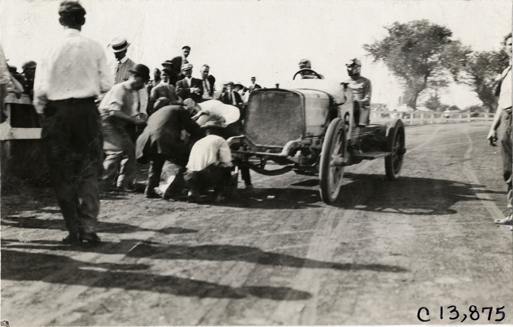 View of driver and passenger in car no. 8 on side of track during the 1908 automobile races at the Elkwood Park racetrack in Long Branch, New Jersey. Several men examine front end of car. Stamped on back: "Spooner & Wells, Inc., photographers, telephones 3472-3473 Columbus, 1931 Broadway, New York." Handwritten on back: "Races and racing--Long Branch races, 1908."