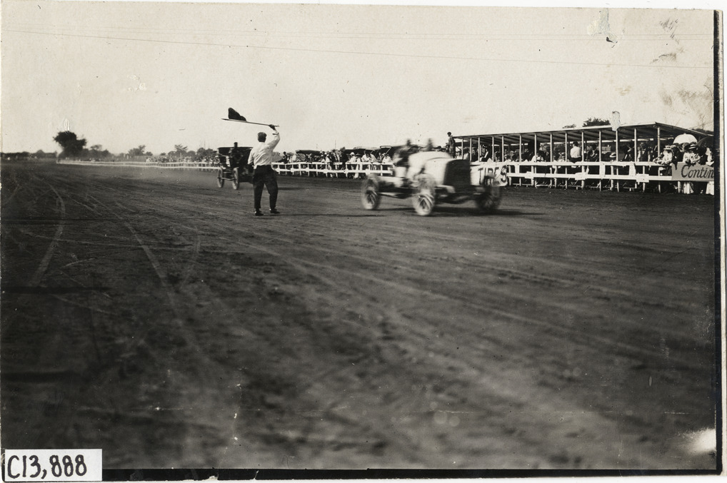Racecar crossing finish line, 1908 Long Branch races