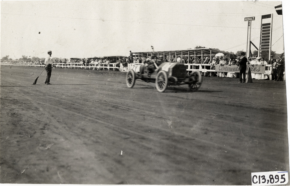 Racecar crossing finish line, 1908 Long Branch races